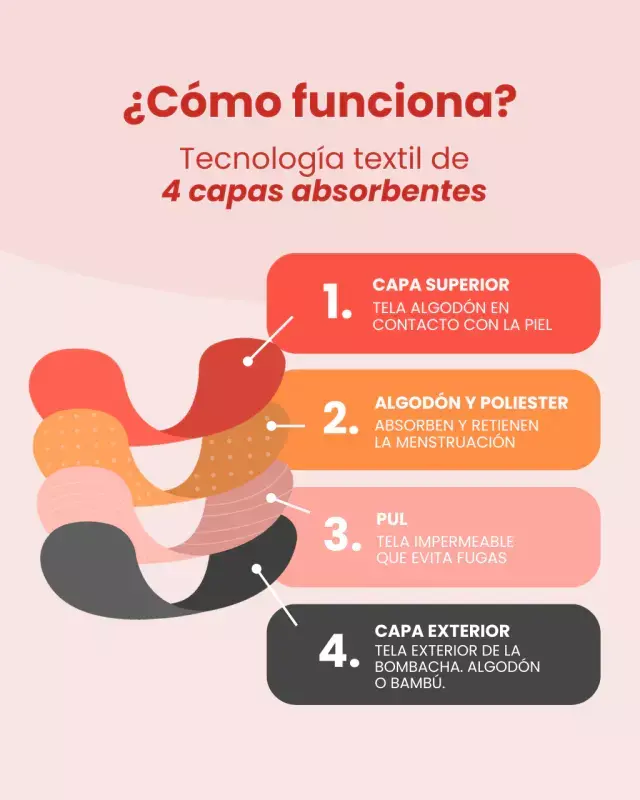 Confeccionadas en lycra premium, con un núcleo absorbente e impermeable que reemplaza toallitas y tampones descartables.